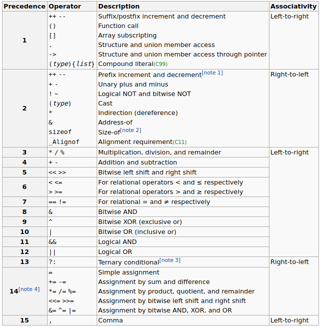 모든 연산자는 우선순위(Precedence)와 결합 방향(Associavity)을 갖는다. 우선순위는 우리가 초등학교 때 배운 수학에서의 우선순위와 같다. 1 + 2 * 3의 우선순위가 없다면, 그 값이 9가 될지 7이 될는 모르는 것이다. 이러한 상황을 피하기 위해선 연산자 간의 우선순위를 정해서, 우선순위가 높은 순서대로 계산을 해야한다.