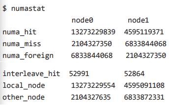 numastat은 메모리가 로컬 노드와 리모트 노드에 할당된 비율을 보여준다. numa_hit은 로컬 노드에 할당된 횟수를, numa_miss는 reclaim을 피하기 위해 리모트 노드에 할당된 횟수를 보여준다. other_node는 numa_miss를 포함하여 리모트 노드에 할당된 횟수를 보여준다. 아까 커널의 중요한 자료구조는 일부러 여러 노드에 걸쳐 할당한다고 했는데, 그건 의도적으로 리모트 노드에 할당한 것이므로 numa_miss에는 포함되지 않지만 other_node에는 포함된다.