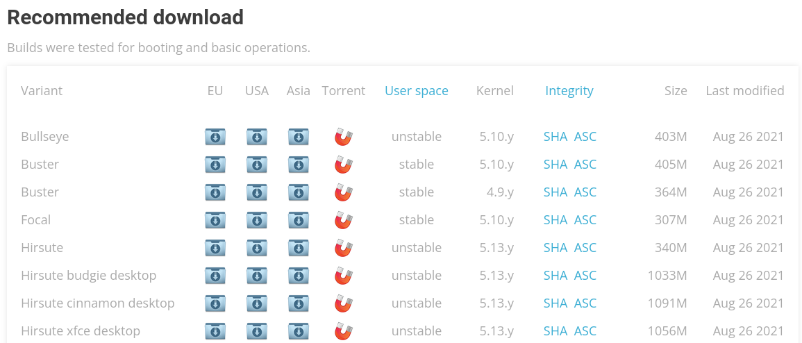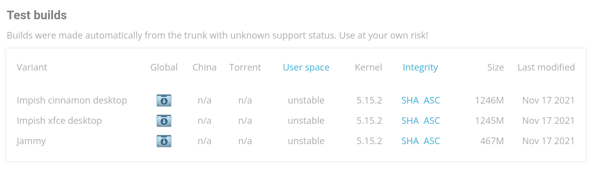 나는 최신 커널을 사용할 것이므로 Test builds 에서 다운받았다. Test builds는 자동으로 빌드하고 테스트가 안된 이미지라 제대로 작동하지 않을 수도 있다. 다행히 내 N2+, HC4에서는 잘 돌아간다.