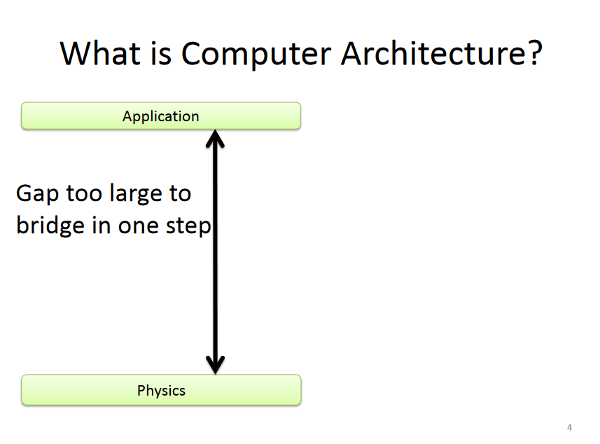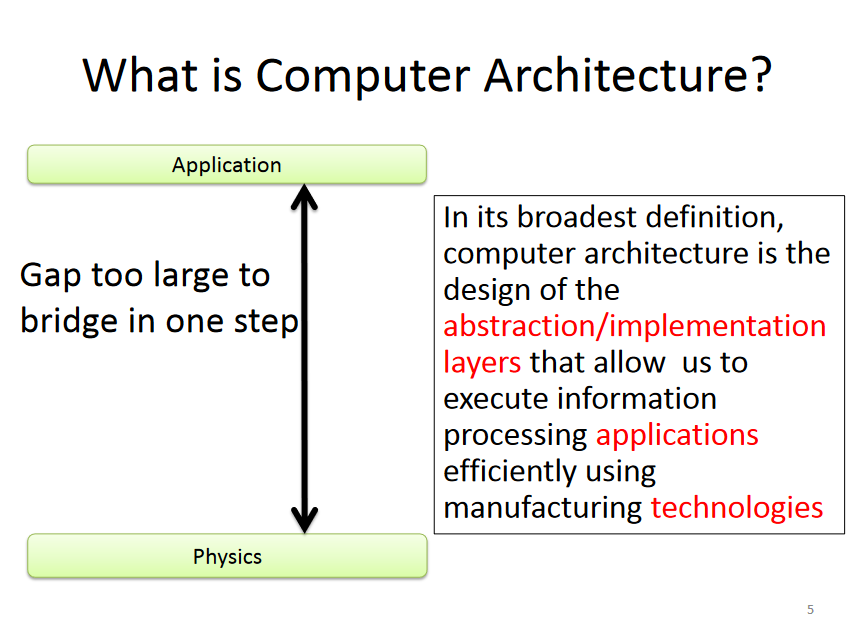 그래서 컴퓨터 아키텍처는 넓은 의미로 보면 Application과 Phyics 사이의 갭을 해결하는 것이라고 할 수 있다.