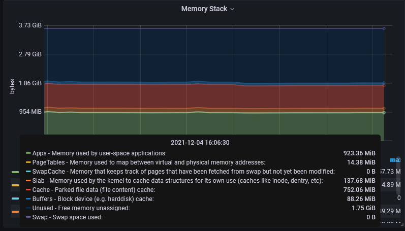 여기서 buffers와 cache는 얼마나 많은 메모리가 파일시스템/디스크 등에 의해 캐시로 사용되는지를 나타낸다. free 메모리가 많다면 메모리의 일정 부분은 buffers와 cache에 사용된다. 예를 들어서 내 오드로이드의 메모리 사용량을 보면 CPU가 IDLE 상태임에도 불구하고 Buffers + Cache가 800MiB가 넘는다. 이러한 메모리는 어플리케이션이 필요로 할 때 쉽게 반납할 수 있다. 다만 buffers/cache가 너무 낮으면 파일시스템 성능이 급격하게 저하될 수 있다.