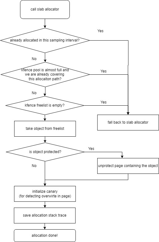 KFENCE는 샘플링 기반으로 작동한다. 다시 말해서 슬랩에서 객체를 할당한다고 KFENCE pool에서 무작정 할당을 하는 게 아니라 일정 주기에 따라 KFENCE pool에서 할당한다.