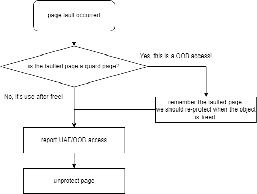 page fault handling도 매우 간단하다. 우선 page fault가 일어나는 경우는 2가지다. 1) guard page에 접근했거나 2) free 상태인 객체에 접근(use-after-free)했거나다.