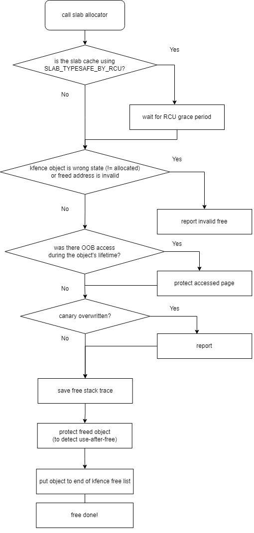 바로 저번 글에서 다룬 KASAN은 메모리 접근 시마다 __asan_loadN(), __asan_storeN()을 호출해서 올바른 접근인지를 검증했다. 그런데 메모리에 읽고 쓸때마다 함수를 실행한다는 건 오버헤드가 크기 때문에 production 서버에서는 사용하기 어렵다. KFENCE는 모든 메모리 접근을 추적하는 대신 슬랩에서 할당하는 객체들 중 일부 샘플들에 대해서만 메모리 관련 버그를 탐지한다. KFENCE는 KASAN이 탐지할 수 있는 버그의 부분집합 정도만 탐지할 수 있다. [mail] [commit]
