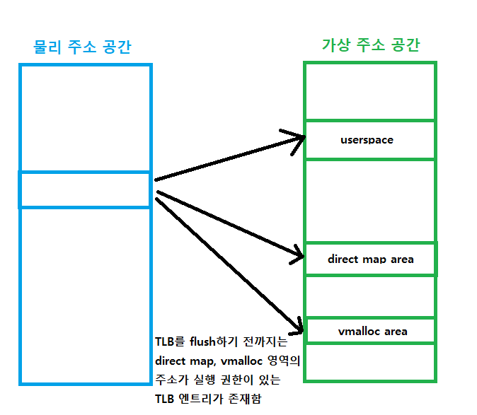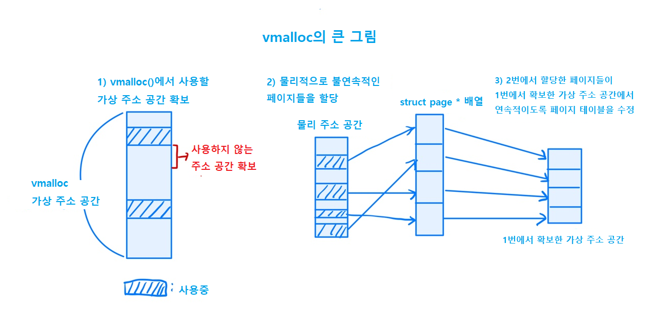 하지만 항상 물리적으로 연속적인 메모리를 할당할 수는 없는데, 할당하려는 메모리의 크기가 클 수록, 메모리가 단편화될 수록 물리적으로 연속적인 메모리를 할당하기가 어려워진다. vmalloc()은 물리적으로 연속적인 메모리를 할당하는 대신, 물리적으로 흩어진 메모리들을 가상 주소 상으로 연속적이도록 페이지 테이블을 초기화한다. vmalloc()으로 할당된 객체는 direct map 영역이 아니라 vmalloc 전용의 가상 주소 공간을 사용한다. [x86_64 memory map, kernel doc]