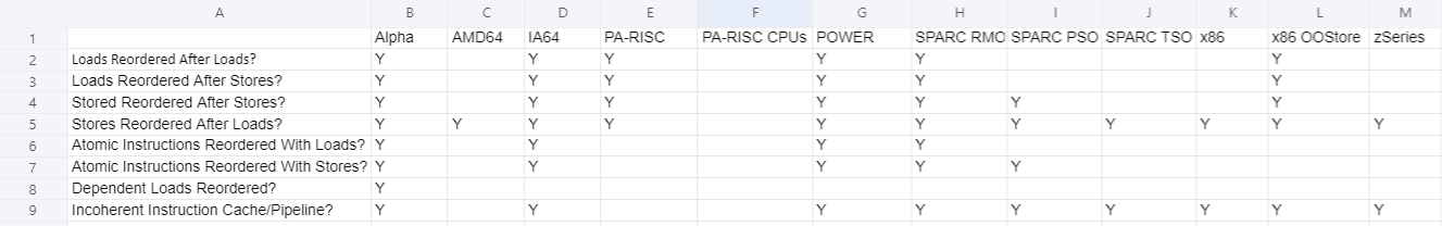 위 표는 [1]에서 빌려온 것이다. 처음 네 행은 load 연산 뒤로 store 연산을, load 연산 뒤로 load 연산을, store 연산 뒤로 store 연산을, store 연산 뒤로 load 연산을 재배치할 수 있는지 여부를 나타낸다. 나머지 두 행은 원자적 명령어의 메모리 연산과 load/store 연산의 순서가 바뀔 수 있는지를 나타낸다.