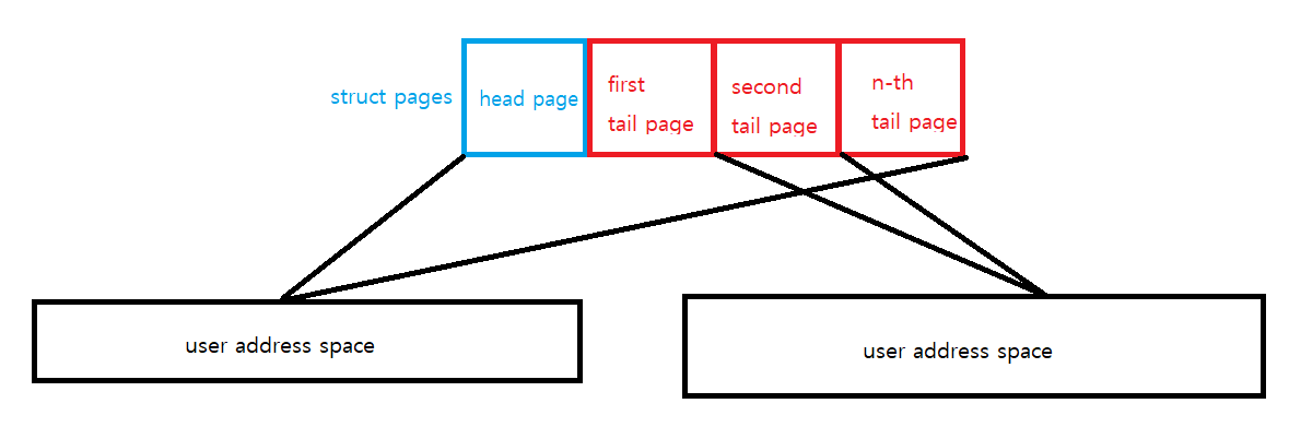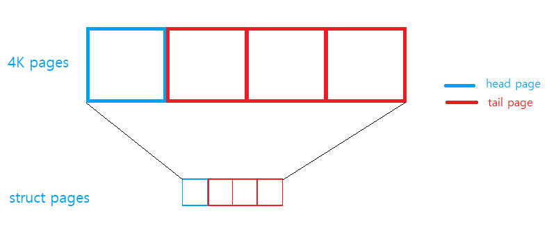일반적인 non-compound page (order == 0)와는 달리 compound page는 2^n개의 페이지 프레임을 하나의 페이지로 취급한 것이다. 아래 사진은 order-2 compound page를 그림으로 나타내 보았다. compound page에서는 가장 맨 앞에 있는 page가 head page이고, 그 외의 모든 페이지는 tail page라고 한다.