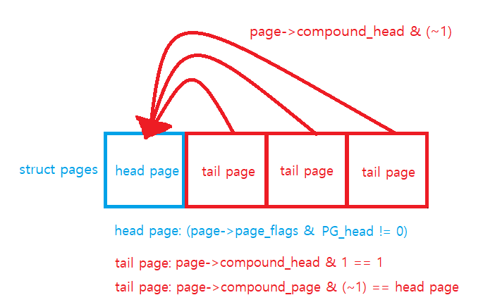 그림을 그려봤다. 어떤 페이지가 head page라면 PG_head 플래그가 켜져있어야 하고, tail page라면 compound_head의 비트 0이 1이어야 한다. 따라서 compound_head와 같은 오프셋을 갖는 필드의 비트 0이 1이면 compound page가 아니더라도 tail page라고 착각할 수 있다.