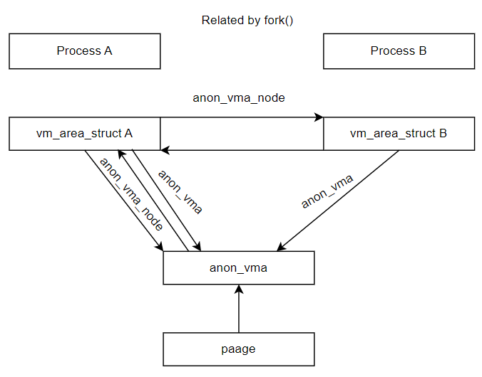VMA는 fork() 혹은 split/merge를 통해 연관지어진다. fork()를 해서 부모의 VMA로부터 자식의 VMA가 복사될 때는, 자식의 VMA가 부모의 VMA와 같은 anon_vma를 가리켜서 하나의 페이지 프레임이 여러 프로세스의 VMA에 매핑된 경우를 rmap walking으로 탐색할 수 있다.