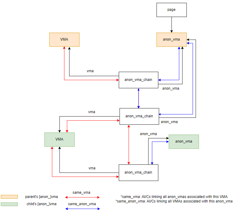 페이지 폴트가 발생하면 anon_vma가 생성되고, AVC가 VMA와 anon_vma를 연결한다. 이 때, 그림의 빨간색 화살표는 "VMA와 연관된 모든 anon_vma를 가리키는 AVC"의 리스트이고 (same_vma), 파란색 화살표는 "anon_vma와 연관된 모든 VMA를 가리키는 AVC"의 리스트 (same_anon_vma)이다.