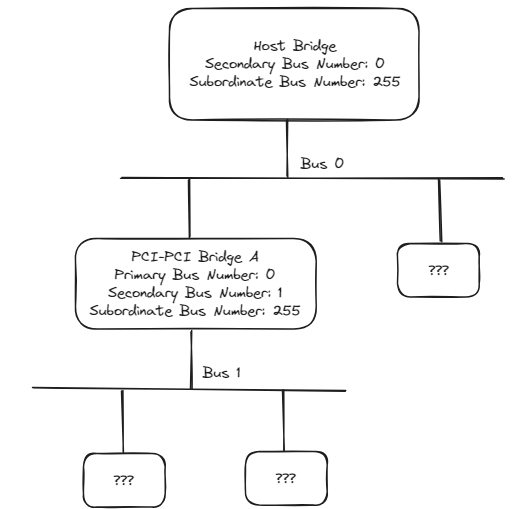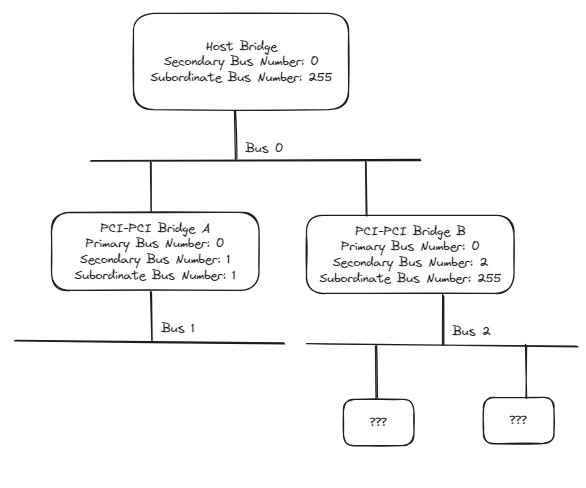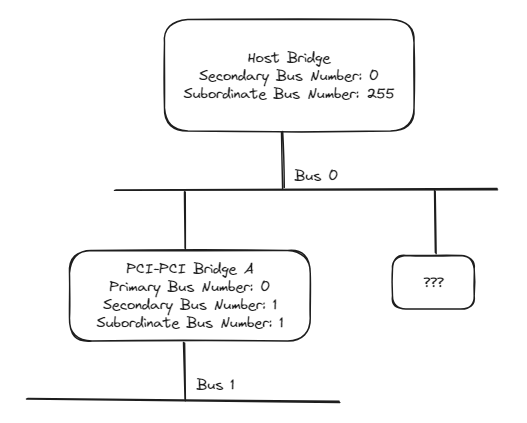만약 디바이스가 존재한다면 (Vendor ID != FFFFh) Header Type을 확인해서 이게 브리지인지 엔드포인트인지 확인한다. 여기서는 BDF (0, 0, 0)의 1이고, 이걸 브리지 A라고 하자. 펌웨어는 브리지의 Primary Bus Number를 0으로 설정하고, Secondary Bus Number는 번호를 할당해주어야 한다. 단순하게 1로 부여하자. 호스트 브리지에서와 마찬가지로 마찬가지로 Subordinate Bus Number는 일단 255로 설정한다.