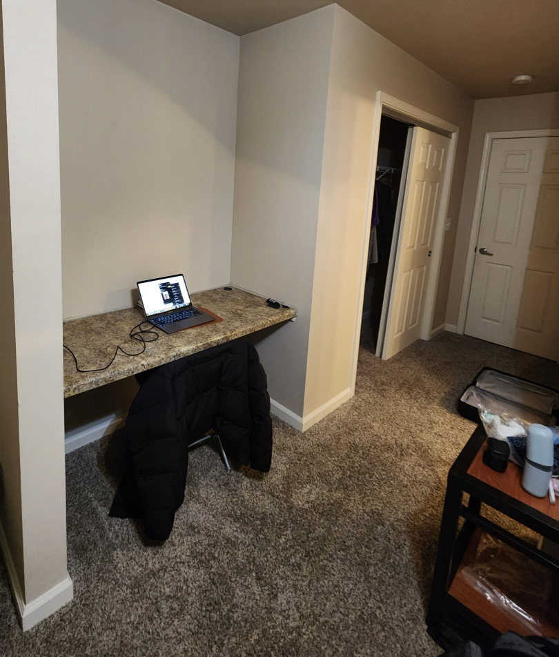 생활은 4명이서 각자 화장실과 방을 하나씩 사용하고, 거실과 부엌을 공유한다. 숙소의 이름은 Lark West Lafayette 이다. 라크에는 퍼듀 학생들이 많이 살아서 캠퍼스로 가는 21A Lark & Alright 버스를 운영한다. 이 버스는 라크 열쇠를 보여주면 탑승할 수 있는데, 6시 30분 이후에는 버스가 끊긴다는 단점이 있다. 21A 말고 (라크에서 운영하지 않는) CityBus는 PUID를 보여주면 무료로 탑승할 수 있다. 저녁에 버스가 끊기면 (~9시 즈음까지) 21A 대신 10번 버스를 타도 집에 갈 수 있는데, 조금 더 걸어야 한다. 9시보다 늦게 집에 가면 Uber나 Lyft를 탄다.