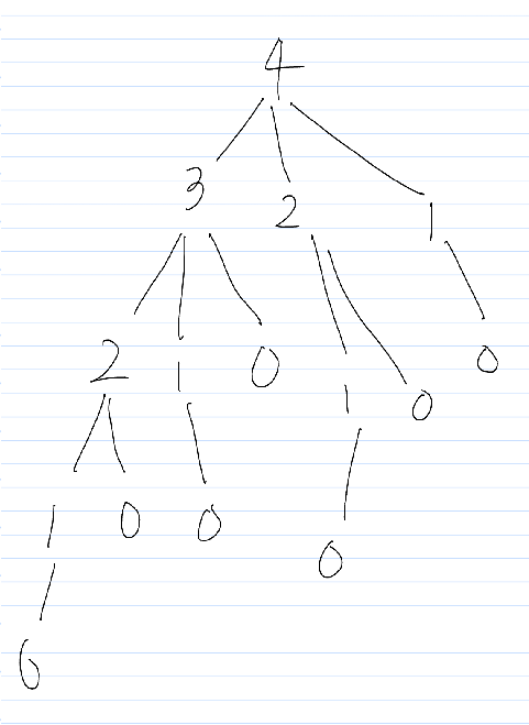 위의 트리를 때, 4가 자식 중 0의 개수는 4 - 1, 4 - 2, 4 - 3, 즉 3, 2, 1 의 자식인 0의 개수를 모두 더한 것과 같다.