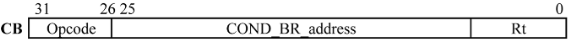 CB-format은 conditional branch 명령어에 사용된다. 이때 opcode는 8비트, COND_BR_address는 19비트, Rt는 5비트이다. COND_BR_address도 마찬가지로 워드 단위이다.